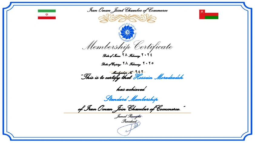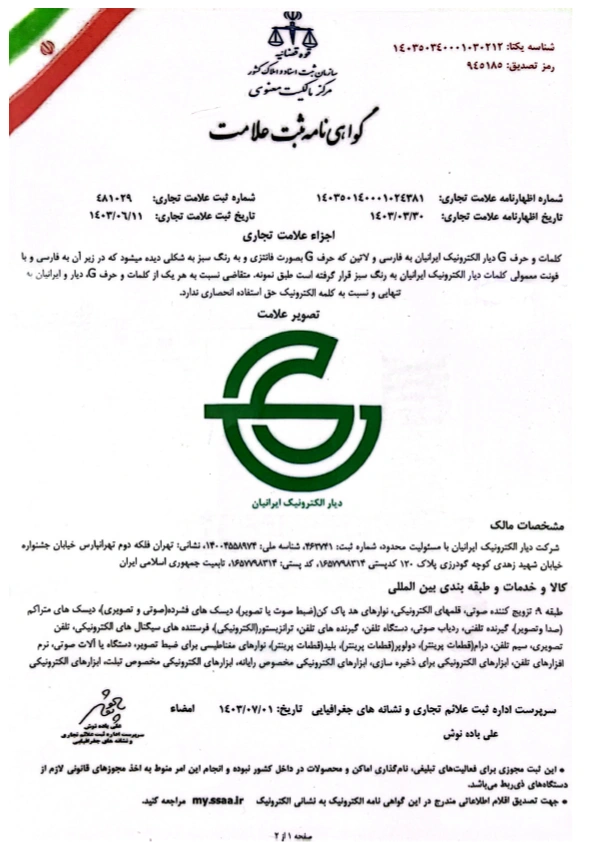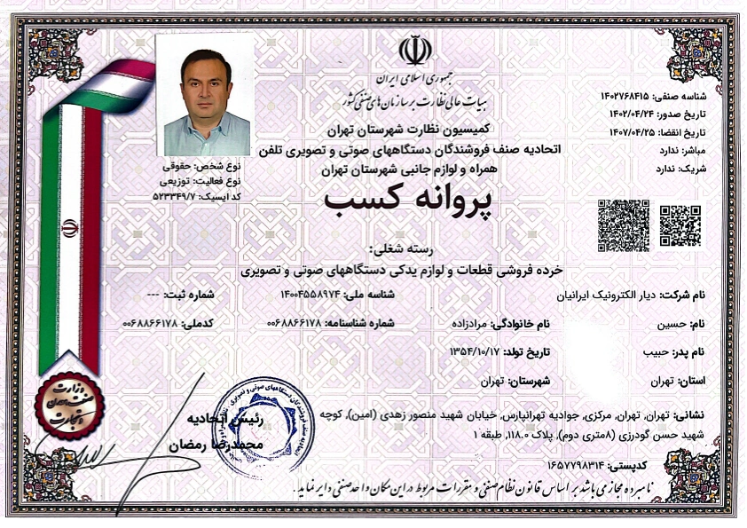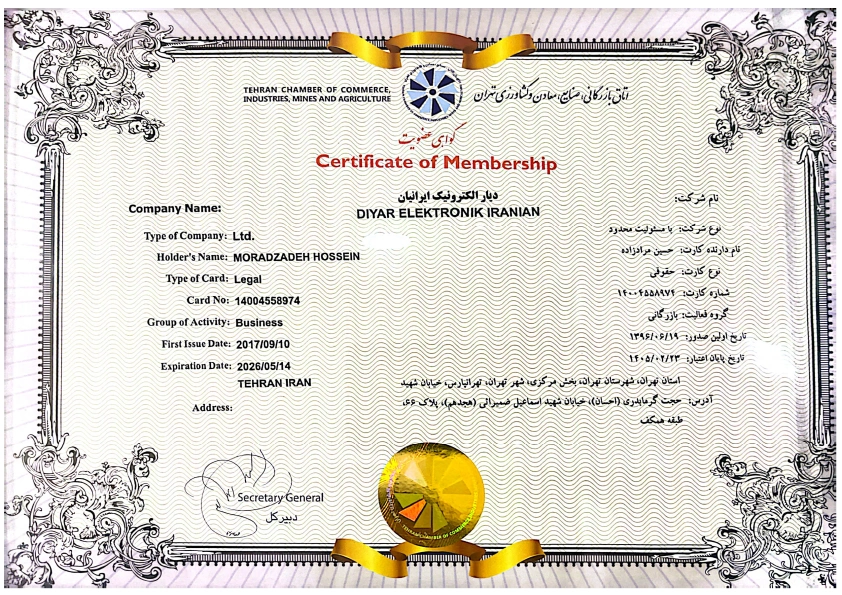 شرکت دیار الکترونیک ایرانیان گواهینامهها و افتخارات Certificates & Honors Certificate of Membership of Tehran Chamber of Commerce گواهی عضویت اتاق بازرگانی تهران تاریخ صدور: 1396 Certificate of Membership of Iran–Oman Chamber of Commerce گواهی عضویت اتاق ایران و عمان تاریخ صدور: 2024 Business License پروانه کسب تاریخ صدور: 1402 Trademark Registration Certificate گواهینامه ثبت علامت تاریخ صدور: 1403